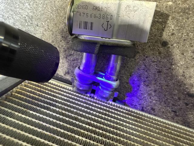 上部に見えるエキスパンションバルブと配管の間にはOリングがありますが、その下側が反応しています。ここはカシメてあって修理が不可能ですのでエバポレータを交換します