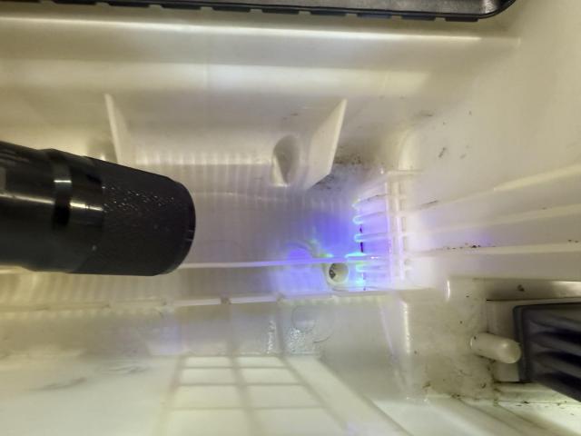 ドレン排水に蛍光剤が溶け込んで、排水にUVライトが反応したのでエバポレータが悪いと確信できました。